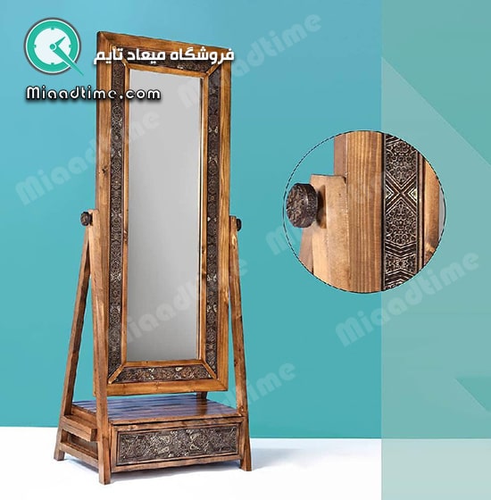 آینه طبقه دار آرتا، یکی از محصولات کاربردی و فوقالعادهی سری محصولات تزئینی گالری آسوریک است. حالت ایستاده این آینه با قابلیت تغییر زاویه دید برای مشاهده بهصورت تمام قد، به همراه طراحی خلاقانه کشوی تعبیه شده در قسمت پایین آن، این محصول را متمایز گردانده است. جنس این آینه، شیشهای بوده و حاشیه بینظیر آن از جنس چوب است که با طراحی زیبای منبت نمای شیک و خاصی را به دکوراسیون محیط اطراف شما میبخشد. از موارد كاربرد این آینه میتوان به استفاده از آن در فضاهاي داخلي، سالنها، محیطهای لوکس و لاکچری مسكوني، تجاري، اداري، سالنهای زیبایی، آتلیهها و تالارهاي لوكس پذيرايي و… اشاره کرد. چوب بکار رفته در حاشیه این محصول از چوب روسی تهیه شده از درخت نراد است. مهمترین درختان برای تهیهی چوب روسی درختان نرمچوب همچون کاج و نراد هستند. به همین دلیل چوب روسی از استحکام، دوام و زیبایی خاصی برخوردار بوده و با قابلیتهای بسیاری که دارد از پرکاربردترین چوبهای موجود در دنیا و ایران است. این چوب در صنایع مبلمان سازی، ساختمانسازی، دکوراسیون، تزئینات مختلف و همچنین محوطهسازی کاربرد دارد. اگر فضای زیادی برای نصب قاب و دیوارکوبهای دیگر ندارید، این آینه با حاشیه سنتی- ایرانی خود، رنگ و لعابی ویژه به محیط اطراف میبخشد و با ایجاد روشنایی، فضا را بزرگتر میکند.