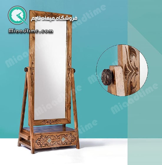 آینه تک کشو طرح فیروزه‌ای، یکی از محصولات کاربردی و فوق‌العاده‌ی سری محصولات تزئینی گالری آسوریک است. حالت ایستاده این آینه با قابلیت تغییر زاویه دید برای مشاهده به‌صورت تمام قد، به همراه طراحی خلاقانه کشوی تعبیه شده در قسمت پایین آن، این محصول را متمایز گردانده است. جنس این آینه، شیشه‌ای بوده و حاشیه بی‌نظیر آن از جنس چوب است که با طراحی زیبای منبت نمای شیک و خاصی را به دکوراسیون محیط اطراف شما می‌بخشد. از موارد كاربرد این آینه می‌توان به استفاده از آن در فضاهاي داخلي، سالن‌ها، محیط‌های لوکس و لاکچری مسكوني، تجاري، اداري، سالن‌های زیبایی، آتلیه‌ها و تالارهاي لوكس پذيرايي و… اشاره کرد. چوب بکار رفته در حاشیه این محصول از چوب روسی تهیه شده از درخت نراد است. مهم‌ترین درختان برای تهیه‌ی چوب روسی درختان نرم‌چوب همچون کاج و نراد هستند. به همین دلیل چوب روسی از استحکام، دوام و زیبایی خاصی برخوردار بوده و با قابلیت‌های بسیاری که دارد از پرکاربردترین چوب‌های موجود در دنیا و ایران است. این چوب در صنایع مبلمان سازی، ساختمان‌سازی، دکوراسیون، تزئینات مختلف و همچنین محوطه‌سازی کاربرد دارد. اگر فضای زیادی برای نصب قاب و دیوارکوب‌های دیگر ندارید، این آینه با حاشیه سنتی- ایرانی خود، رنگ و لعابی ویژه به محیط اطراف می‌بخشد و با ایجاد روشنایی، فضا را بزرگ‌تر می‌کند.
