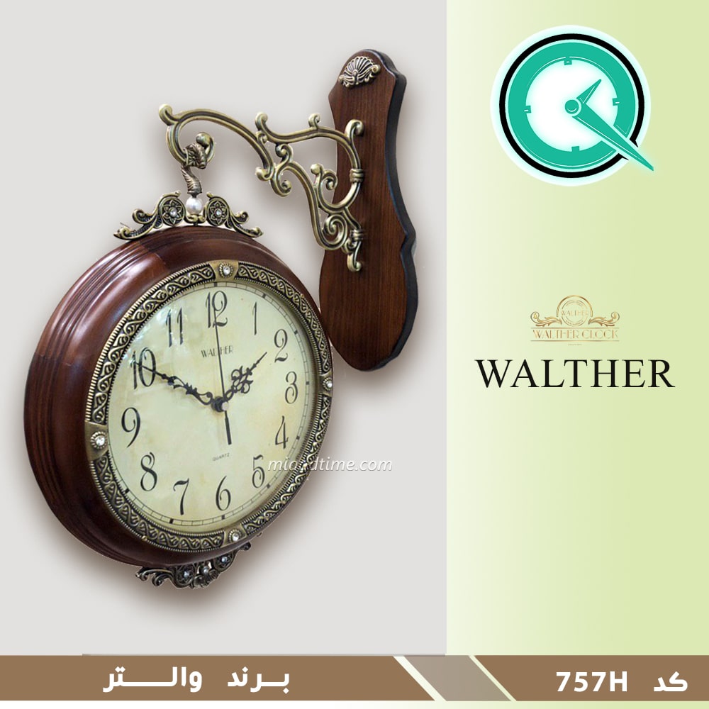 این طرح از ساعت دیواری دو طرفه چوبی دور طلایی از برند والتر  می باشد. نوار فلزی پهنی که دورآن قرار گرفته و همینطور بند های فلزی طرح داری که آن را به قسمت چوبی متصل کرده است، دارای ظرافت خاصی است. برخلاف ساعت های یک رو که تنها از یک طرف و معمولا به طور مستقیم قابل رویت است، ساعت های دو طرفه دیواری این امکان را دارد که از دو جهت مختلف به صورت واضح دیده شود. این ساعت های دوطرفه چوبی از وسط به راحتی باز می شوند و به راحتی می توان باطری را در آن قرار داد. ناگفته نماند ساعت های دو طرفه دارای دو موتور هستند. بنابراین نیاز به دو عدد باطری دارد.