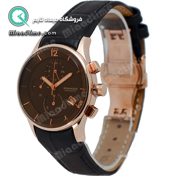ساعت مچی رومانسون زنانه کرنوگراف گرد چرمی رزگلد صفحه مشکی شیشه رنگی کد 5054