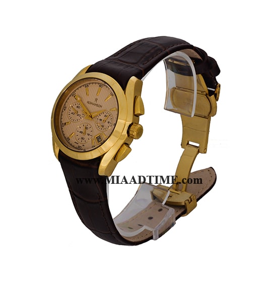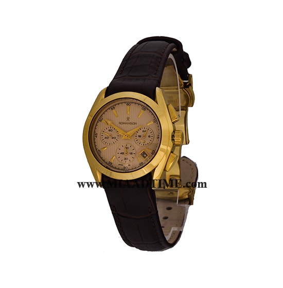 ساعت مچی رومانسون زنانه کرنوگراف گرد چرمی طلایی صفحه روشن کد 1861