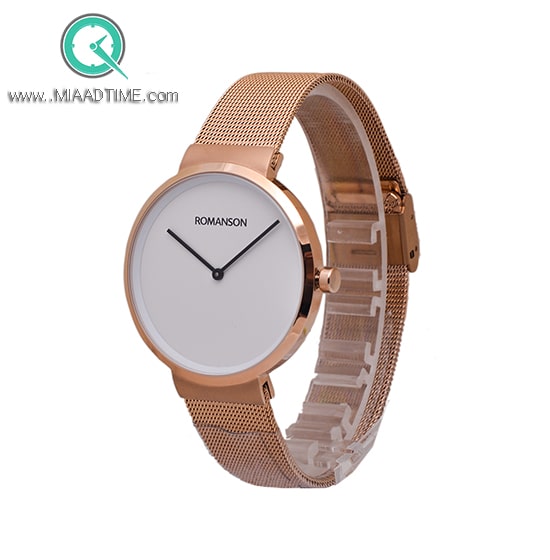 ساعت مچی رومانسون مردانه صفحه سفید رزگلد بند حصیری کد 25472