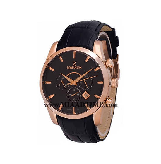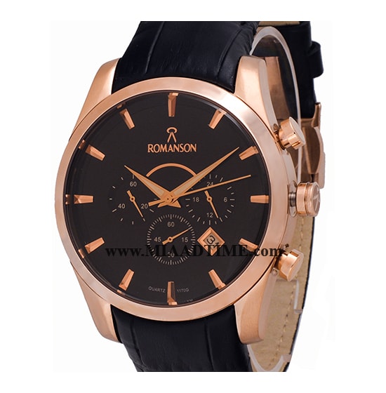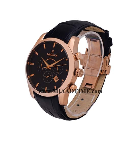 ساعت مچی رومانسون مردانه کرنوگراف گرد چرمی رزگلد صفحه مشکی کد 16271