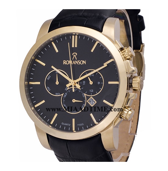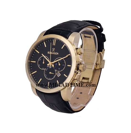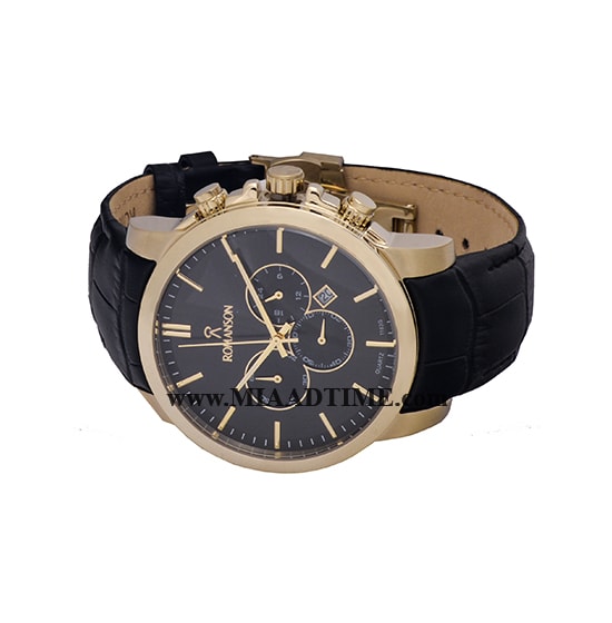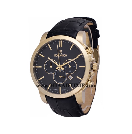 ساعت مچی رومانسون مردانه کرنوگراف گرد چرمی طلایی صفحه مشکی کد 16261