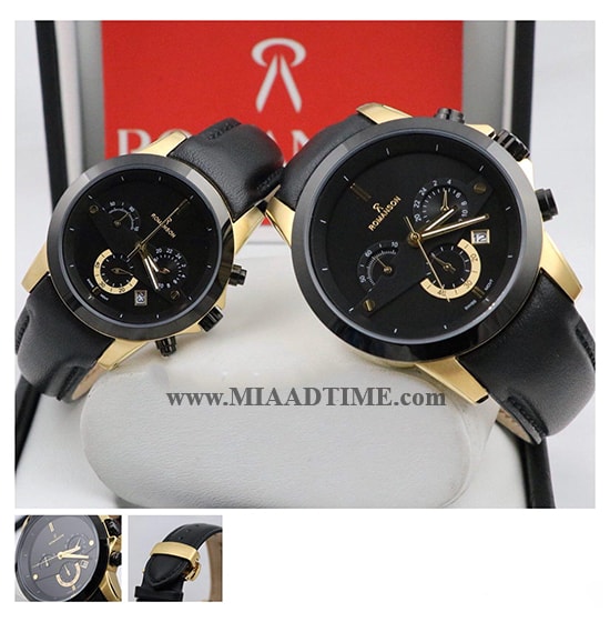 ساعت مچی ست رومانسون گرد چرمی مشکی طلایی صفحه مشکی کد 11026