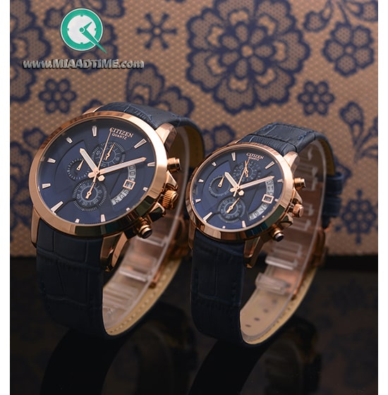 ساعت مچی ست سیتیزن کرنوگراف گرد چرمی رزگلد صفحه سرمه ای مدل 25470