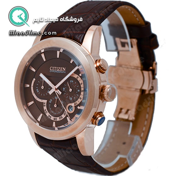 ساعت مچی سیتیزن مردانه کرنوگراف گرد چرمی رزگلد صفحه قهوه ای مدل 5065