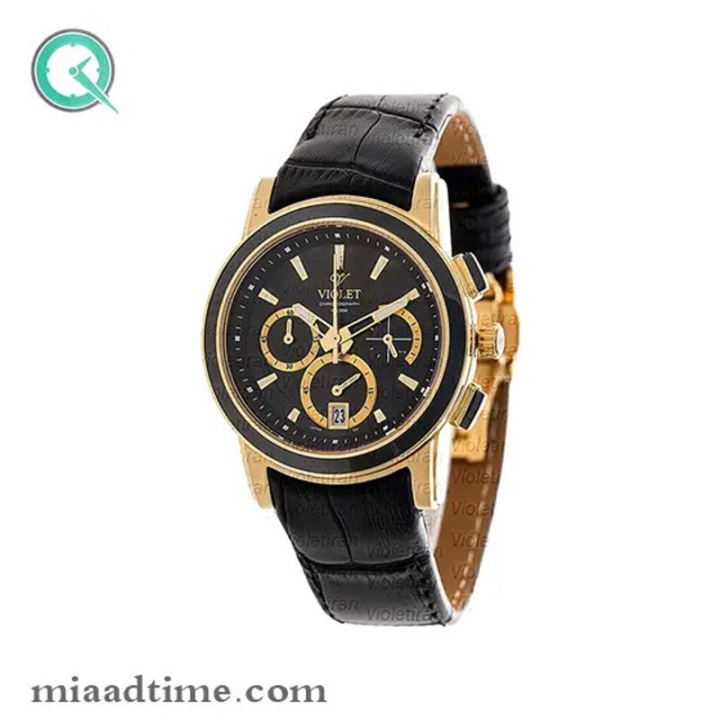 ساعت مچی ویولت،زنانه کرنوگراف، گرد چرمی،طلایی مشکی،صفحه مشکی | کد 0412/2L