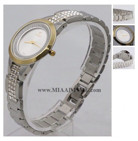 ساعت مچی ویولت زنانه گرد نگین دار فلزی دو رنگ صفحه سفید کد 11042
