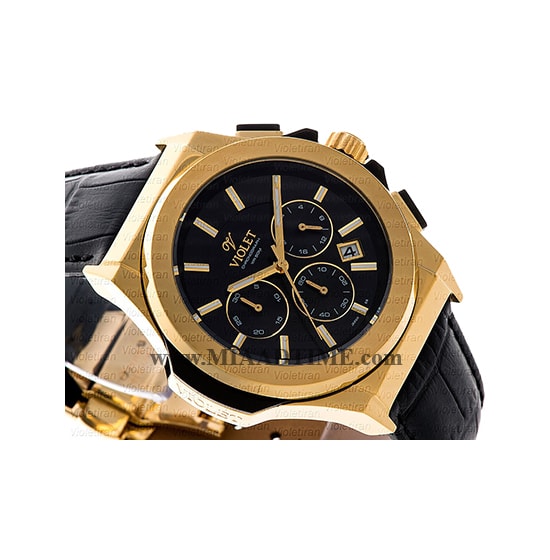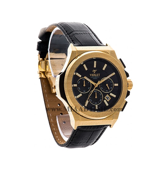 ساعت مچی ویولت مردانه کرنوگراف گرد بند چرم طلایی صفحه مشکی مدل 0452/2G