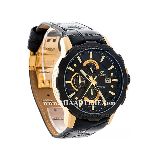 ساعت مچی ویولت مردانه کرنوگراف گرد چرمی طلایی مشکی صفحه مشکی مدل 0414/2G
