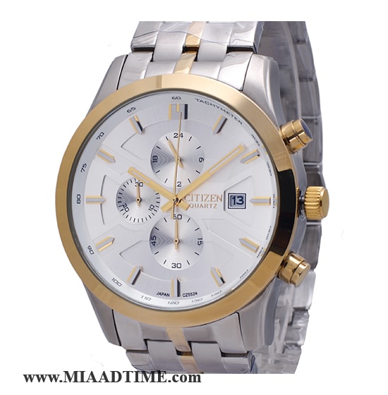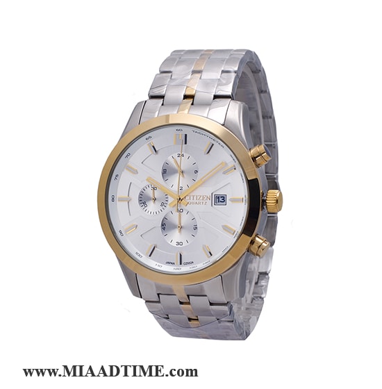 ساعت مچی CITIZEN مردانه کرنوگراف گرد فلزی دو رنگ طلایی صفحه سفید کد 21447