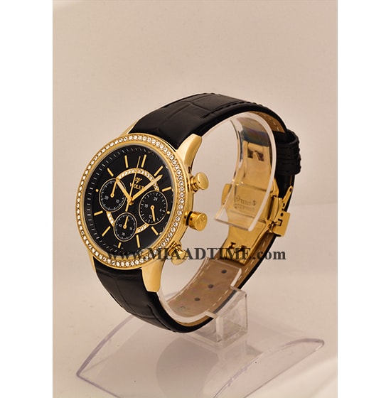 ساعت ویولت زنانه کرنوگراف گرد چرمی طلایی صفحه مشکی نگین دار مدل 0480/2