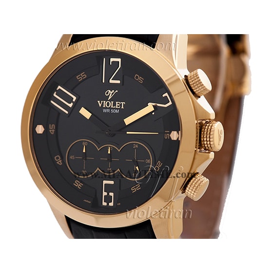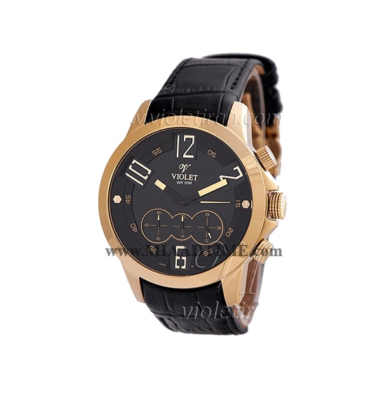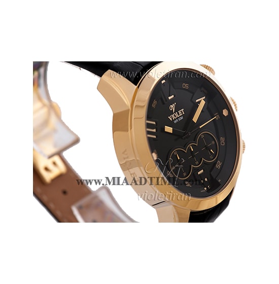ساعت ویولت Violet مردانه کرنوگراف گرد چرمی طلایی صفحه مشکی کد 0244/2G