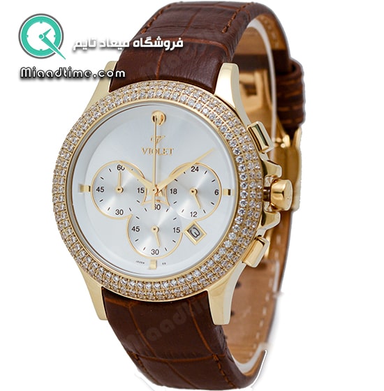 ساعت ویولت Violet زنانه کرنوگراف چرمی نگین دار طلایی صفحه سفید کد 0471/2L
