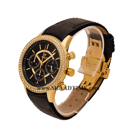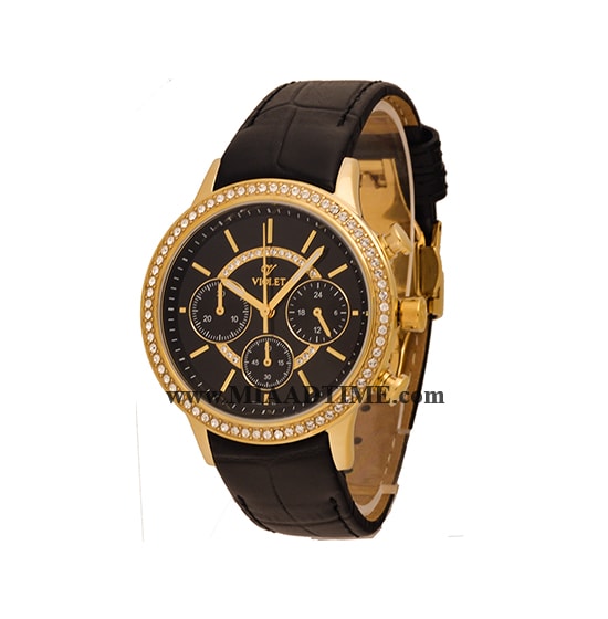ساعت ویولت Violet زنانه کرنوگراف گرد چرمی طلایی صفحه مشکی کد 0480/2