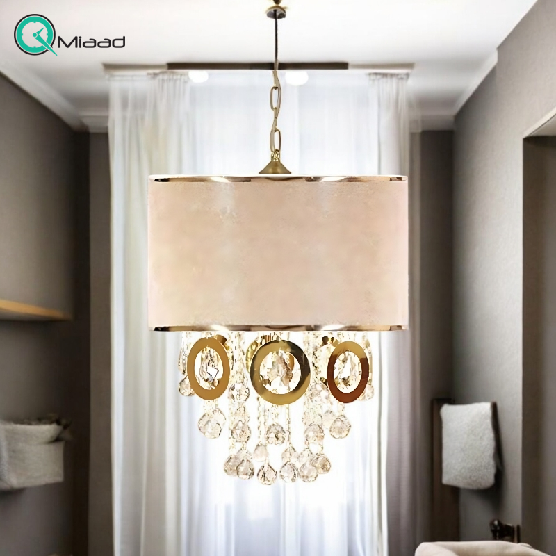 لوستر سقفی مدل 102، لوستر سقفی خاص با متریال طلق و پارچه کلاهک با رنگ بندی متنوع ، دارای 6 عدد سرپیچ شمعی E14 و 18 آویز و 8 حلقه قطر 12 سانت با 15 حلقه کوچک