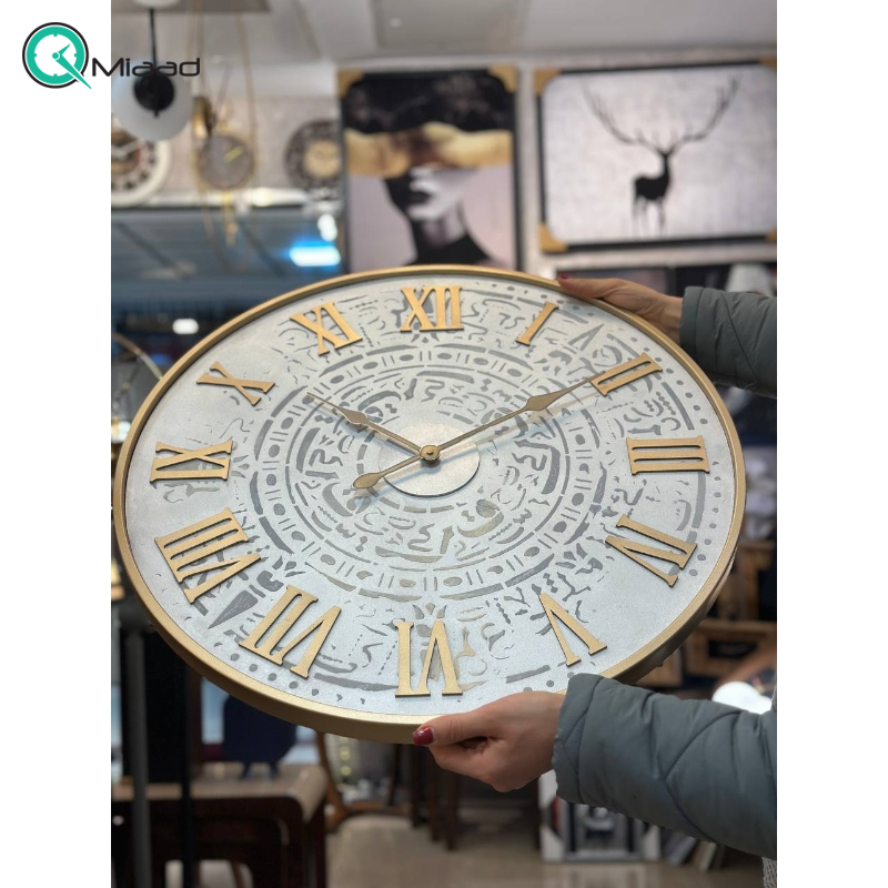 ساعت دیواری بسیار زیبا و کلاسیک که ظاهری واقعا شکیل دارد. فونت رومی اعداد که با زیبایی هر چه تمامتر در صفحه ساعت خودنمایی می کنند، این ساعت را چشمگیر تر کرده است؛ چرا که فونت اعداد برجسته و بزرگ می باشد و با رنگ طلایی نمایش داده شده است. متریال فلزی و چوب در این مدل استفاده شده است.