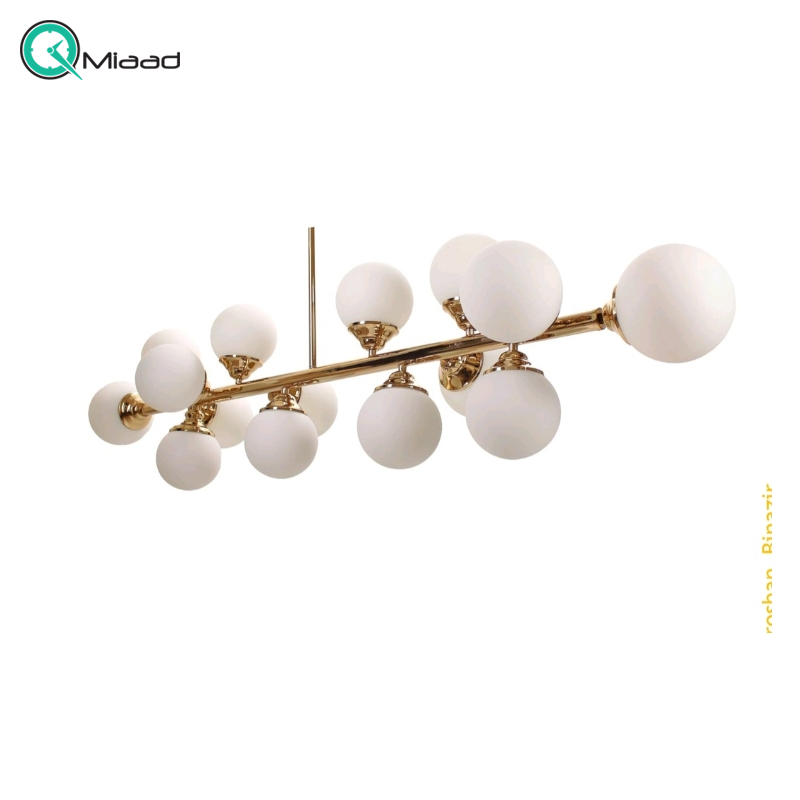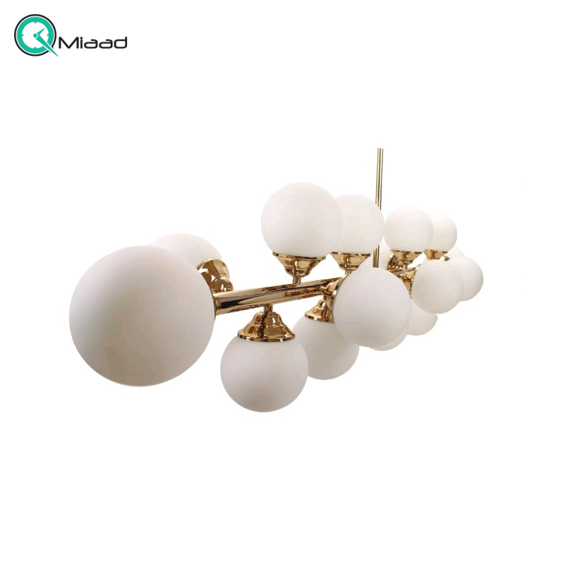 طراحی مدرن و جذاب، بدنه از جنس آهن آبکاری شده، حباب های شیشه ای، دارای 14 حباب و 14 سرپیچ شمعی E14