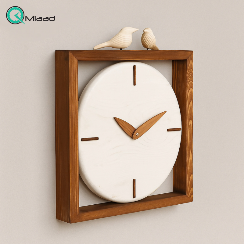 ساعت دیواری چوبی دست ساز مدل 132 کاملا دست ساز و تمام اجزای آن حتی پرنده ها، ساخته شده از چوب طبیعی باکیفیت است. موتور تایوانی که برای این مدل ساعت استفاده شده، آرام گرد و بدون صداست و هیچ گونه صدای تیک تاکی ندارد و براحتی در اتاق خواب نیز میتوانید آن را نصب کنید. ترکیب رنگی صفحه با اعداد و عقربه باعث شده تا ساعت از فاصله دور هم خوانایی بالایی داشته باشد و زیبایی ساعت را نیز دوچندان کند.