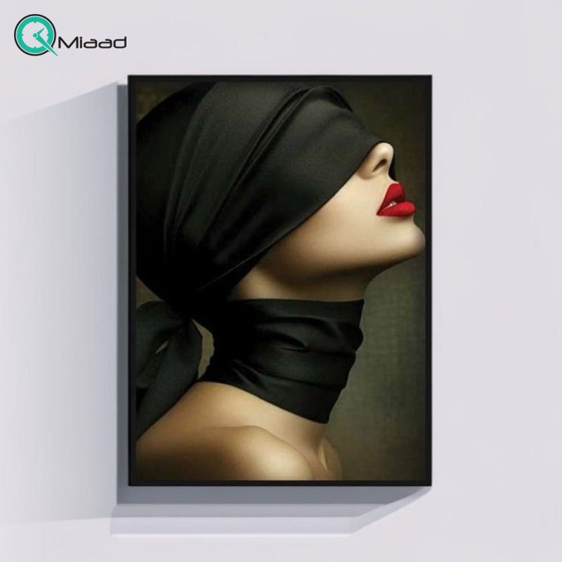 تابلو با فریم پی وی سی با کیفیت ساخت بالا، زیبایی بصری چشمگیر، طرح های بی نظیر روی تابلو، طرح زن با چشم‌بند مشکی