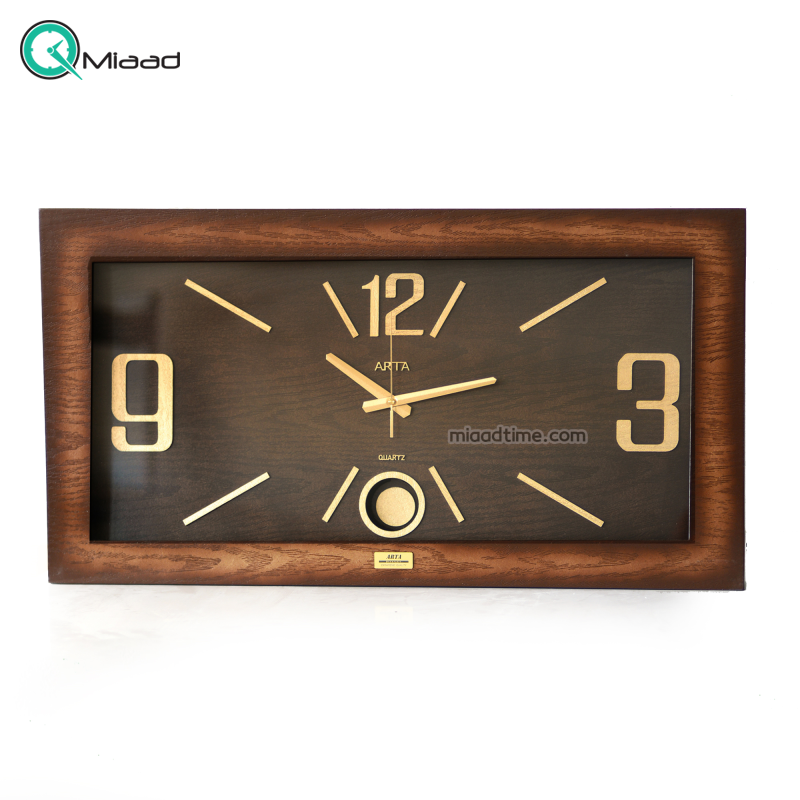 ساعت دیواری آرتا Arta کد 421، ساعت دیواری چهارگوش چوبی با متریال MDF، دارای پاندول و اعداد لاتین، دارای موتور آرامگرد، رنگ قهوه ای
