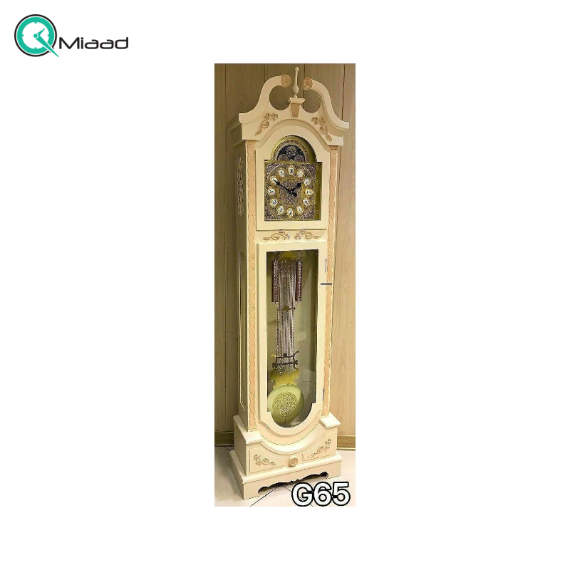 ساعت ایستاده و کنارسالنی مدل G65 رنگ کرم استخوانی یکی از مدل های پرطرفدار موجود در بازار است که با متریال چوب با روکش راش ،درب شیشه ای، زیبایی این مدل دوچندان شده است. طراحی زیبای بدنه و صفحه این مدل ساعت نگاه هر بیننده ای را در مرتبه اول به خود جلب می کند و فضای دکور منزل و یا محل کار شما را به کلی تغییر می دهد. موتور ساعت آرام گرد و تایوانی است.