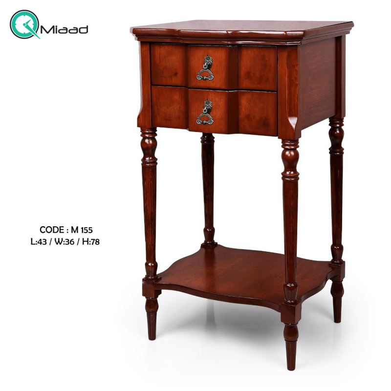 میز تلفن دو کشو چوبی مدل 155 یک میز تزیینی و دکوراتیو میباشد که میتواند فضایی برای نگه داری لوازم دکوری در اختیار شما قرار دهد. یکی از وسایل سنتی و تزیینی که از دیرباز در منازل و ادارات رایج بوده است میز تلفن است که می توانید تلفن، گرامافون، ضبط، رادیو تزیینی و وسایل مشابه خود را روی آن قرار دهید. در واقع پایه یا میز تلفن نه تنها وسیله ای برای قرار دادن گوشی در یک مکان خاص است، بلکه یک وسیله تزیینی زیبایی است که در آپارتمان های شیک یافت می شود. میزهای تلفن معمولا دارای ابعاد کوچک و جمع و جور هستند که در یک گوشه میتواند قرار بگیرد و البته مکان استفاده از میزهای تلفن کاملا سلیقه ای است.