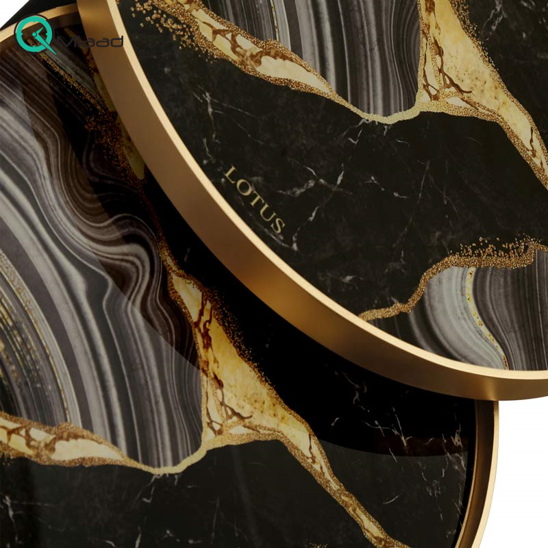 میز عسلی 3 تکه NAPOLI، طرح ALMA، دارای شیشه متحرک با چاپ مستقیم روی شیشه است. طراحی روی شیشه همیشه بادوام و با کیفیت خواهد بود. پایه های پیچ چوبی نیز در این مدل گنجانده شده است. جزئیات طراحی شیشه به قدری زیباست که نمی توانید به آن خیره شوید. رنگ مشکی، رنگ طلایی و رنگ خاکستری در طراحی به کار رفته است تا در عین زیبایی با طرح شما همخوانی داشته باشد. نقش سنگ حس خوبی دارد و آن را منحصر به فرد و خاص می کند. شیشه روی میز متحرک است و به راحتی تمیز می شود. طرح روی شیشه بصورت مستقیم چاپ شده و دارای لایه محافظ می باشد تا بتوان با خیال راحت از آن استفاده کرد. رنگ شیشه با گذشت زمان از بین نمی رود.