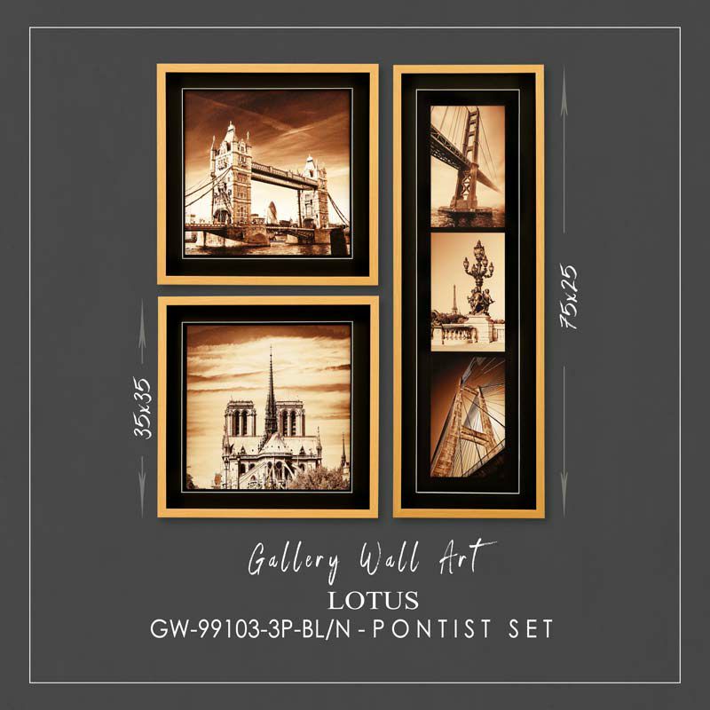 تابلو چوبی مدرن لوتوس مدل GW 99103 3P BL N معروف به ست پانتیست ، یک مجموعه سه تکه از زیباترین پلهای زیبای جهان است : پل لندن ، پاریس ،لئون اسپانیا، سانفرانسیسکو که در کنار هم در کنار تصاویر زیبای دیگر یک گالری زیبا رو به نمایش می گذارند. شما می توایند این تابلو را هم بصورت ست وال گالری سفارش دهید و یک ست زیبا روی دیوار خودتان داشته باشید و یا اینکه بصورت تکی سفارش دهید و با تابلوهای دیگر محیط ست کنید و یک گالری زیبا روی دیوار خودتان دکور کنید. پروفیل کُره ای این تابلو لوتوس، رنگ نچرال چوب با بک گراند مشکی در هارمونی با رنگ رترو و قدیمی عکس ها ، ست زیبایی را ایجاد کرده که چشم نواز است.