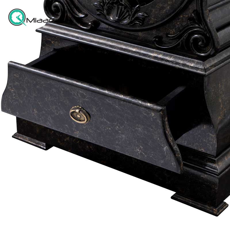 بدنه از جنس MDF روکش چوب راش، طراحی زیبا و منحصربفرد، موتور تایوانی، دارای موتور زنگ و پاندول، رنگ مشکی رگه های طلایی خاص به سبک سنگ ماربل پتینه شده، رنگ مشکیماربل