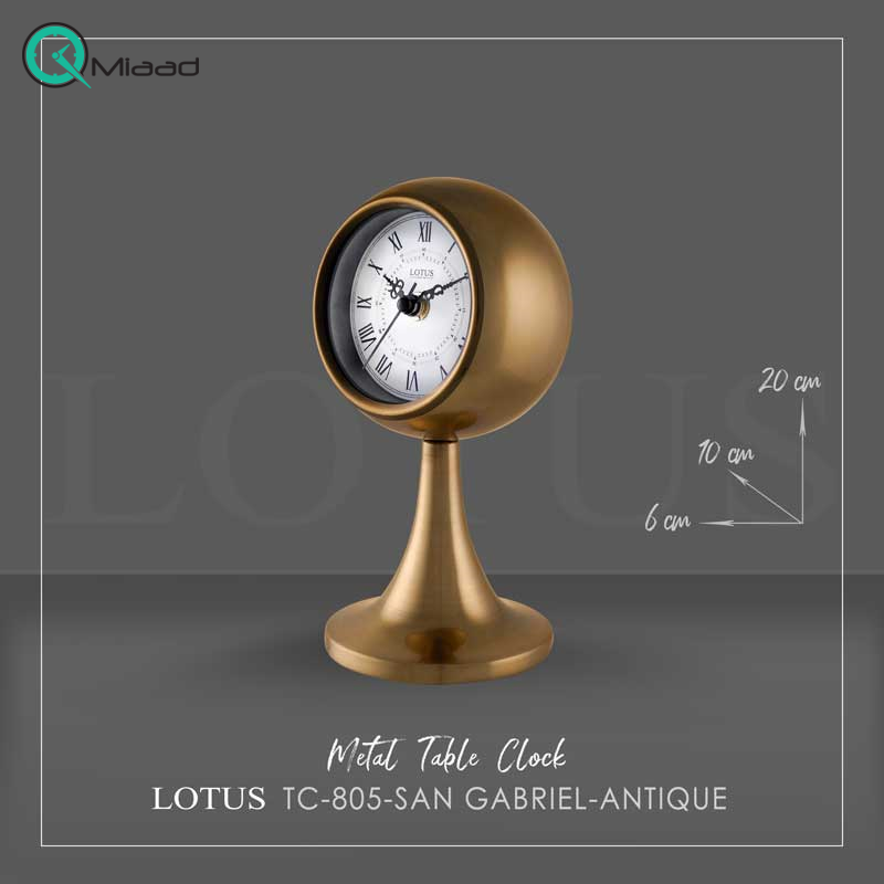 ساعت رومیزی فلزی لوتوس مدل 805 از سری ساعت های رومیزی جدید شرکت لوتوس است که طراحی خاص و زیبایی دارد. این ساعت تمام فلزی در رنگ های آبکاری طلایی، نقره ای، آنتیک و رنگ های استاتیک مشکی و سفید به بازار عرضه شده است و همین طیف رنگی کامل انتخاب را برای افرادی که قصد خرید ساعت رومیزی دارند بسیار راحت می کند. ساعت های رومیزی مدل سن گابریل به دلیل سایز کوچک این قابلیت را دارند که در فضاهای مختلف از جمله روی میز کنسول،میز کنار تخت، میز عسلی مورد استفاده قرار گیرند. استفاده از زه فلزی با آبکاری طلایی دور فریم ساعت، زیبایی این مدل ساعت را دوچندان کرده است. موتور این مدل ساعت رومیزی آرام گرد و تایوانی است که دارای کیفیت بسیار بالا و 5 سال ضمانت بدون قید و شرط می باشد. همچنین ساعت رومیزی سن گابریل به عنوان هدیه گزینه مناسبی می باشد.