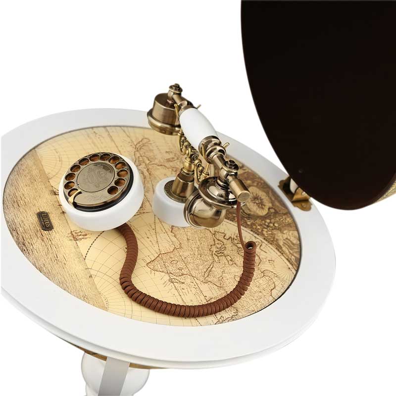 تلفن پایه دار چوبی میز کره ای لوتوس مدل TG-811 با ارتفاعی مناسب، ظاهری زیبا و چشم نواز دکور منزل و محیط کاری شما را چشم نواز تر از قبل می کند. درب کُره به آسانی باز و بسته می شود تا بتوانید براحتی از تلفن استفاده کنید و همچنین هر زمانی که تمایل داشتید نمای زیبای داخل کره را نشان دهید. بدنه این تلفن کلاسیک ترکیبی از چوب و فلز با نوع آبکاری عالی است که وارداتی است از کیفیت بالایی برخوردار است. شماره گیر تلفن به سبک تلفن های قدیمی است که حس نوستالژیک دارد و شما را به حال و هوای دوران کودکی تان می برد. آبکاری انتیک بخش فلزی این تلفن کلاسیک کیفیت بسیار بالایی دارد و رنگ آن نیز به شکلی ویژه جلب توجه می کند و همین موضوع باعث متمایز شدن این محصول کاربردی و دکوری می باشد.