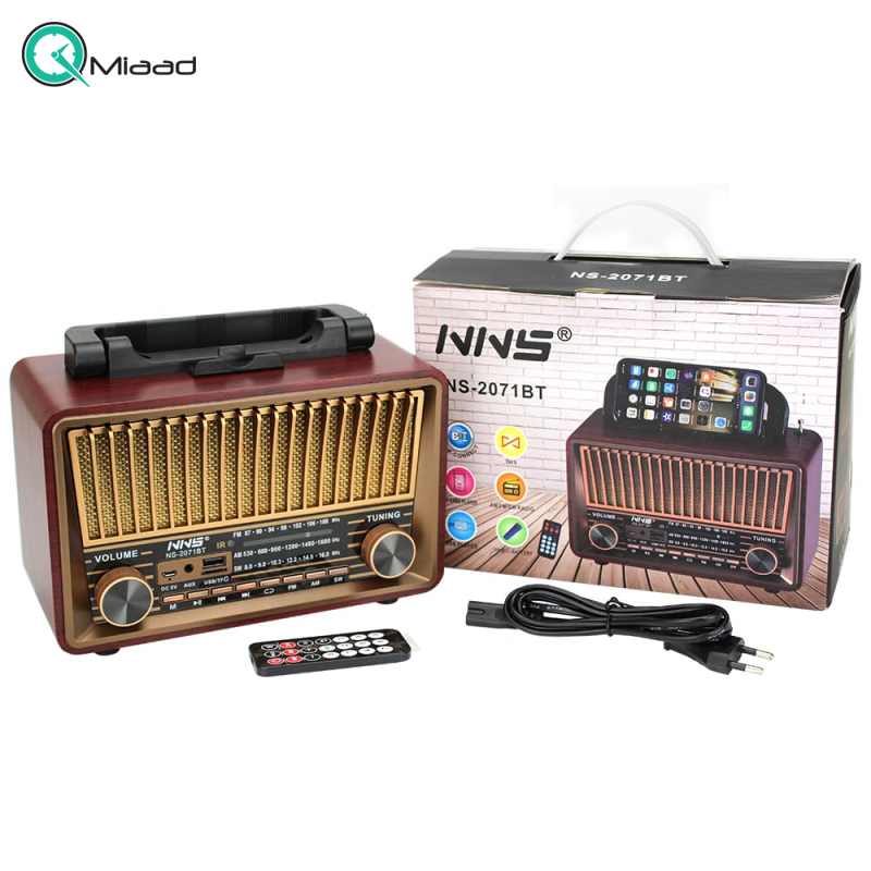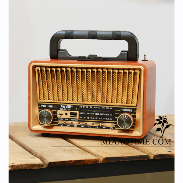 رادیو مدل چوبی NS-2071BT، با رنگ قهوه ای روشن لذت بخش، حس نوستالژی را برای رادیوهای چوبی کلاسیک دوران گذشته به ارمغان می آورد. با این وجود، این رادیو از اینکه یک دستگاه معمولی با عملکردهای قدیمی باشد فاصله زیادی دارد. دارای مجموعه ای چشمگیر از ویژگی ها، از جمله باتری قابل شارژ و گزینه های گوش دادن همه کاره با قابلیت های 3 باند FM / AM / SW است. علاوه بر این، پخش MP3، اتصال USB / TF و سازگاری بلوتوث 5.0 را تسهیل می کند. بلندگوی 3 اینچی 2OU 15W 55HZ خروجی چشمگیر 12 وات را ارائه می دهد و دارای مزیت منحصر به فرد این است که با 2 باتری قابل شارژ تغذیه می شود.