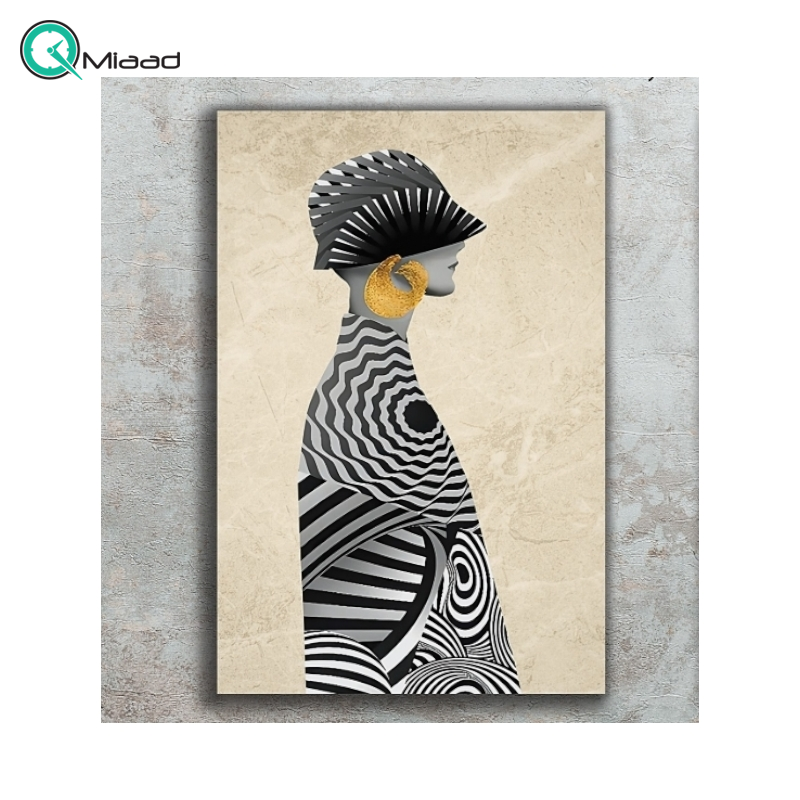 خود را در عظمت یک نقاشی و اثر هنری در اندازه 70x100 غرق کنید. این محصول نفیس از مواد PVC درجه یک ساخته شده است که بیانگر دوام و کیفیت بالا این تابلو بسیار جذاب می باشد. مسلما طراحی حرفه ای و طرح انتزاعی این تابلو می تواند هر دیوار خالی را تکمیل کنید و زیبایی دو چندانی به محیط اضافه کند و سایز بزرگ تابلو هم به این تاثیرگذاری محصول اضافه می کند. طراحی انتزاعی دختر با لباس خاص رنگ سیاه و سفید و طرح های تو در تو نگاه را مجذوب خود می کند و به هر فضایی ظرافت می بخشد. برای به دست آوردن این شاهکار کافی است مراحل خرید را از این قسمت ادامه دهید.