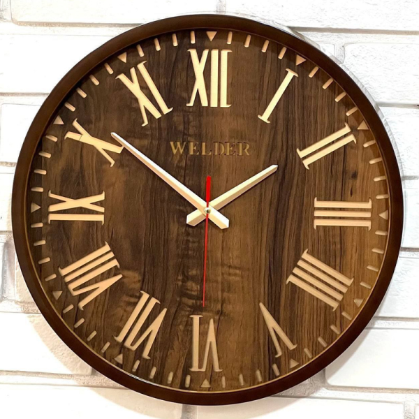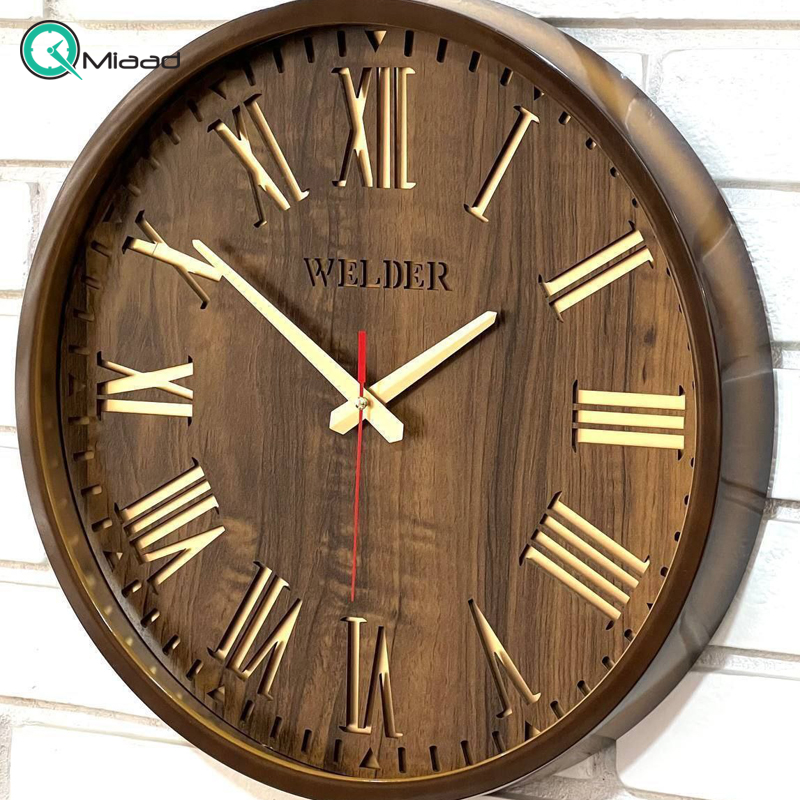 ساعت دیواری ولدر Welder، ساعت دیواری سایز 38 شماره برجسته، دارای فونت رومی اعداد، دارای موتور آٰرامگرد، طرح چوبی شماره برجسته با قاب پلاستیک کیفیت بالا کد 608