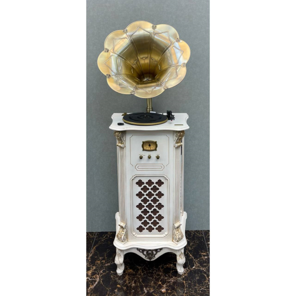 گرامافون ایستاده مبله آنتیک با شیپور بزرگ فلزی 2215 یکی از سری گرامافون های برند آنتیک می باشد که امروز برای شما موجود کردهایم. گرامافون یکی از شیکترین و سنتی ترین وسایل دکوراسیون منزل است. زمانی یک پخش کننده موسیقی محبوب و پرکاربرد در بین دوستداران موسیقی بود. گرامافونهای رومیزی و مبله به دلیل جذابیت همیشگیشان، به دلیل زیبایی و ظرافت منحصربهفردشان، یکی از وسایل دکور خانه و محل کار در عصر حاضر هستند. علاوه بر این، تعدادی از این گرامافون ها ساختاری زیبا و ترکیبی با طراحی معاصر دارند که آنها را برای افرادی با دکوراسیون مدرن تر قابل استفاده می کند.