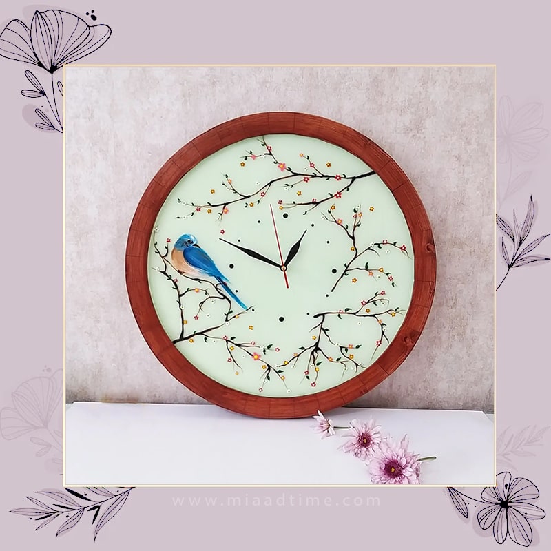 ساعت دیواری چوبی دست ساز مدل 123 کاملا دست ساز طراحی کاملا خاص و منحصربفرد، اثر هنری با استفاده از تکنیک ویترای در زمینه شیشه ای، ساخته شده از چوب طبیعی باکیفیت که قاب دایره ای شامل 36 تکه چوبی به هم متصل شده است. موتور تایوانی که برای این مدل ساعت استفاده شده، آرام گرد و بدون صداست و هیچ گونه صدای تیک تاکی ندارد و براحتی در اتاق خواب نیز میتوانید آن را نصب کنید. ترکیب رنگی صفحه با اعداد و عقربه باعث شده تا ساعت از فاصله دور هم خوانایی بالایی داشته باشد و زیبایی ساعت را نیز دوچندان کند.
