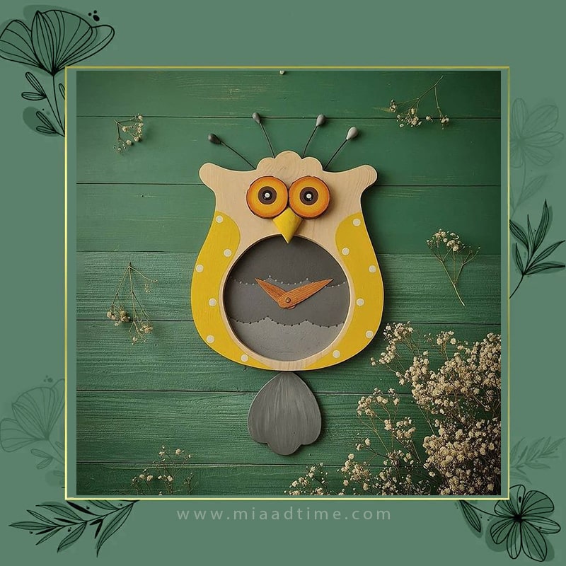 دست ساز ساخت شده با چوب طبیعی،تمام اجزا حتی عقربه ها از جنس چوب با کیفیت ساخت بالا،دارای موتور آرام گرد تایوانی، رنگ زرد