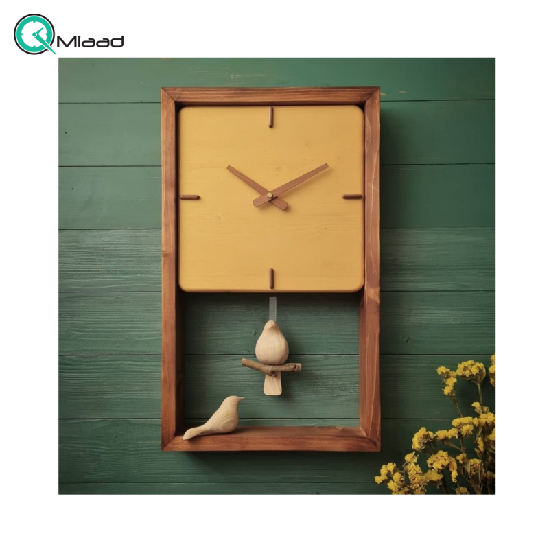 دست ساز ساخت شده با چوب طبیعی،تمام اجزا حتی عقربه ها از جنس چوب با کیفیت ساخت بالا،دارای موتور آرام گرد تایوانی، پاندول طرح مرغ عشق، رنگ طلایی‌بژ