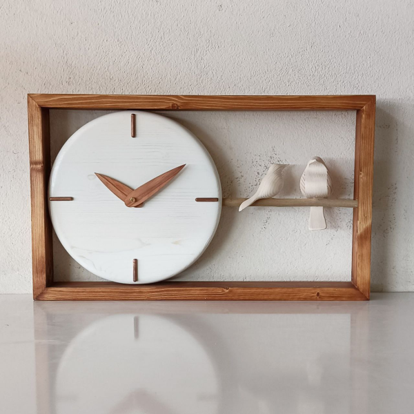 ساعت دیواری چوبی دست ساز مدل 169 کاملا دست ساز و تمام اجزای آن حتی پرنده ها، ساخته شده از چوب طبیعی باکیفیت است. موتور تایوانی که برای این مدل ساعت استفاده شده، آرام گرد و بدون صداست و هیچ گونه صدای تیک تاکی ندارد و براحتی در اتاق خواب نیز می توانید آن را نصب کنید. ترکیب رنگی صفحه با اعداد و عقربه باعث شده تا ساعت از فاصله دور هم خوانایی بالایی داشته باشد و زیبایی ساعت را نیز دوچندان کند.