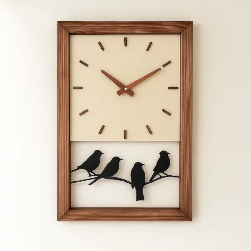 صفحه ساعت با نشانگرهای ساده و مینیمال طراحی شده تا تمرکز اصلی بر روی صحنه زیبای پرندگان و حرکت آرام عقربههای چوبی باقی بماند. قاب مستطیلی این مدل، آن را به گزینهای متفاوت و شیک برای هر دیواری تبدیل کرده است. این ساعت یک انتخاب ایدهآل برای کسانی است که به دنبال اضافه کردن عنصری از طبیعت و هنر به فضای خانه یا محل کار خود هستند.
