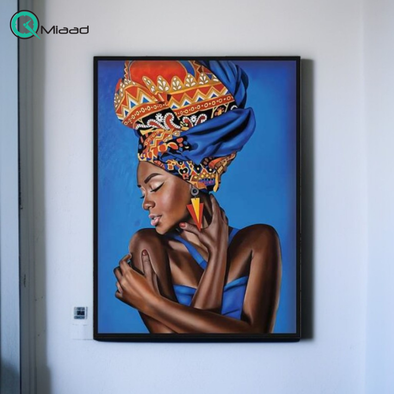 این تابلو هنری از میعاد تایم، تصویری واقع‌گرایانه از یک زن آفریقایی را به نمایش می‌گذار دکه با وقار و آرامش، روی این تابلو نقش بسته است. او روسری سنتی و رنگارنگی بر سر دارد که با طرح‌ها و رنگ‌های گرمش، در تضادی چشم‌نواز با پس‌زمینه آبی ساده قرار گرفته است. گوشواره‌های بزرگ و هندسی و لباس آبی‌اش، هویت فرهنگی و ظرافت هنری اثر را برجسته می‌سازد. جزئیات دقیق در چهره و لباس، حس زنده بودن و عمق بیشتری به این نقاشی بخشیده است.