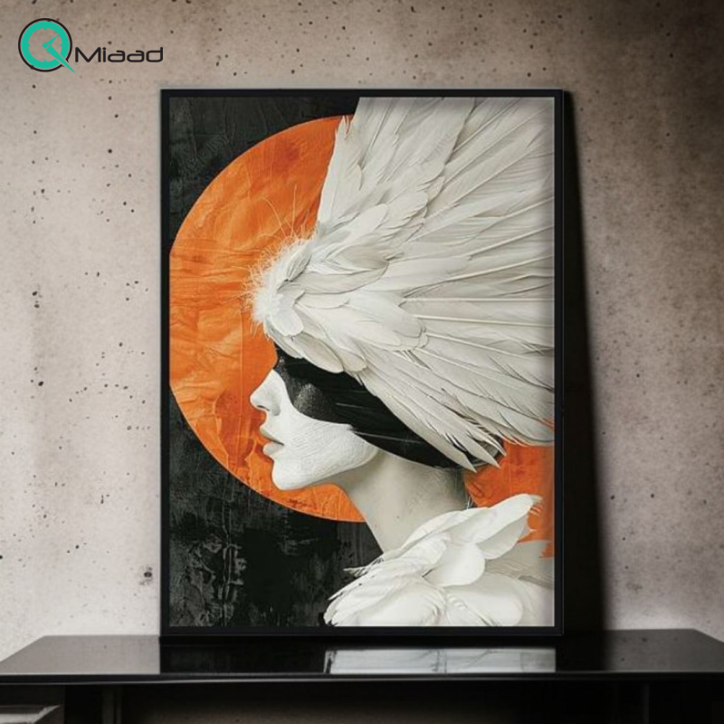 تابلوی پرتره هنری میعاد تایم اثری چشمگیر با جزئیات بصری خیره‌کننده است. در مرکز تصویر، نیم‌رخ زنی با تاجی پرپشت از پرهای سفید دیده می‌شود که بخشی از چهره‌اش زیر ماسکی سیاه پنهان شده است؛ ماسکی که چشم‌ها را می‌پوشاند و تضادی قوی میان نور و سایه ایجاد می‌کند. پس‌زمینه با یک دایره بزرگ نارنجی، یادآور خورشید یا ماه کامل، حس گرما و عمق به ترکیب‌بندی می‌بخشد. ترکیب رنگ‌های سفید، سیاه و نارنجی در این اثر، جلوه‌ای مدرن و انتزاعی ایجاد کرده است.