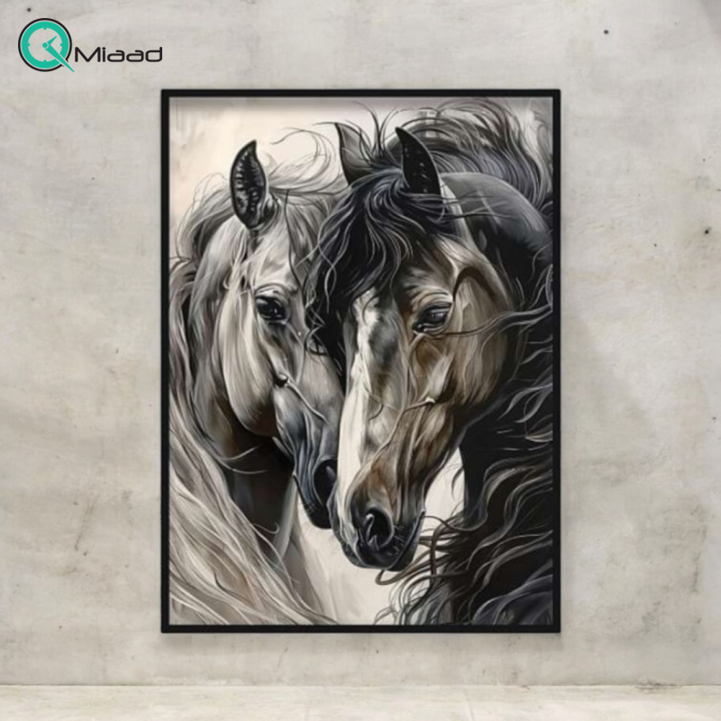 تابلو با فریم پی وی سی با کیفیت ساخت بالا، زیبایی بصری چشمگیر، طرح های بی نظیر روی تابلو، طرح انتزاعی دو اسب