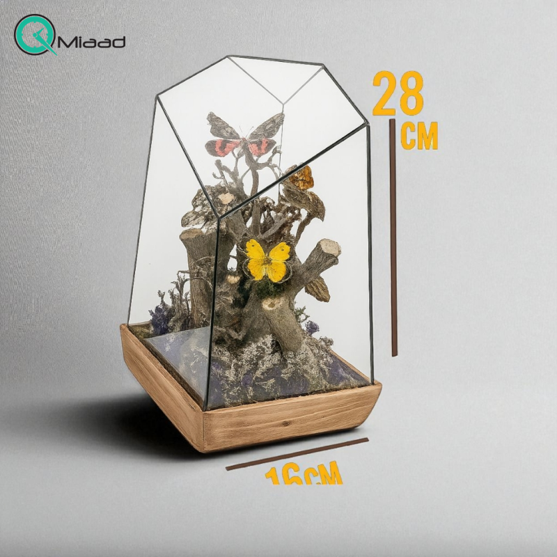 تابلو طراحی شده داخل یک محفظه چند ضلعی شیشه ای، طبیعت مینیمال دست ساز