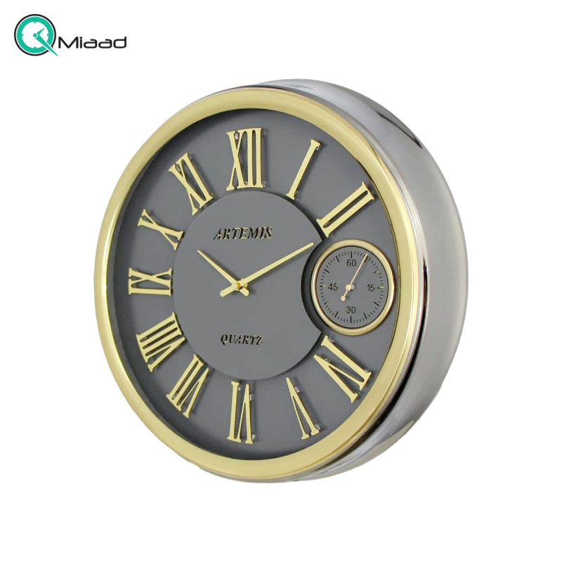 ساعت دیواری فلزی آرتمیس مدل 2039، ساعت دیواری فلزی و آبکاری شده، رنگ تیتانیوم و جزییات طلایی، دارای موتور ثانیه شمار مستقل، سایز 42