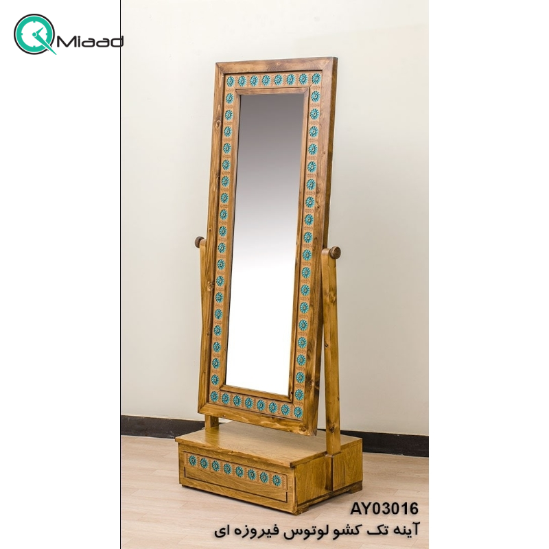 آینه تک کشو لوتوس فیروزه ای با قاب چوبی، دارای دو کشو برای نگهداری وسایل مورد نیاز