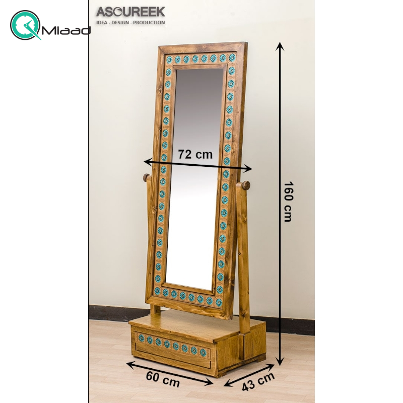 آینه چوبی و بسیار زیبا و ساده که سایز نسبتا مناسبی دارد و به صورت قدی می توانید از این آینه استفاده کنید. جنس این آینه، شیشهای بوده و حاشیه بینظیر آن از جنس چوب است که نمای شیک و خاصی را به دکوراسیون محیط اطراف شما میبخشد. از موارد كاربرد این آینه میتوان به استفاده از آن در فضاهای داخلی، سالنها، محیطهای لوکس و لاکچری مسكوني، تجاري، اداري، سالنهای زیبایی، آتلیهها و تالارهاي لوكس پذيرايي و… اشاره کرد. چوب بکار رفته در حاشیه این محصول از چوب روسی تهیه شده از درخت نراد است. این آینه به یک کشو مجهز شده است که می توانید وسایل مورد نیاز را در این کشو نگهداری کنید.