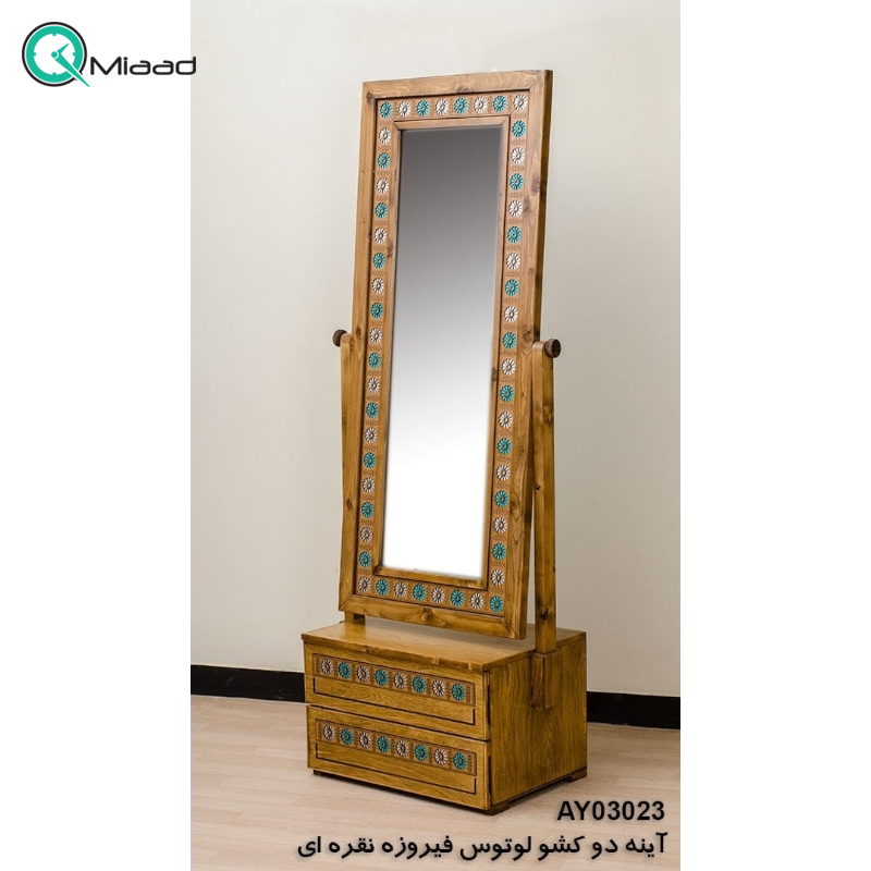 آینه دو کشو لوتوس فیروزه نقره ای با قاب چوبی، دارای دو کشو برای نگهداری وسایل مورد نیاز